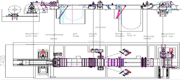 上料—开卷—覆膜—矫平—剪切—导向—分条—废边卷曲—张力站—剪切—收卷—卸料